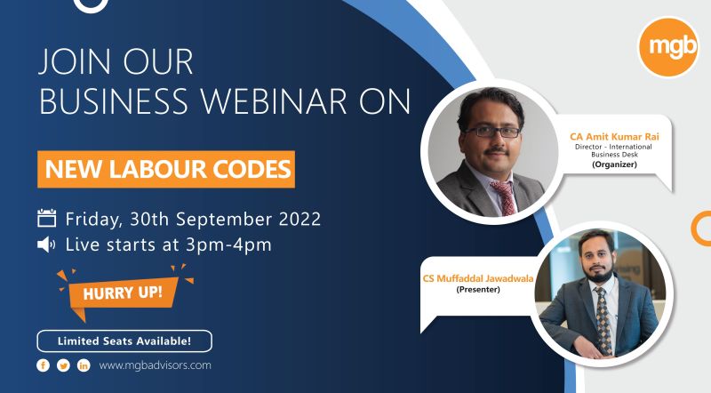 MGB is organizing the Webinar on New Labour Codes on Friday, 30th Sep 2022 at 3 PM IST. Please register yourself at https://bit.ly/3BVXrZe to get the webinar link. Thank you!